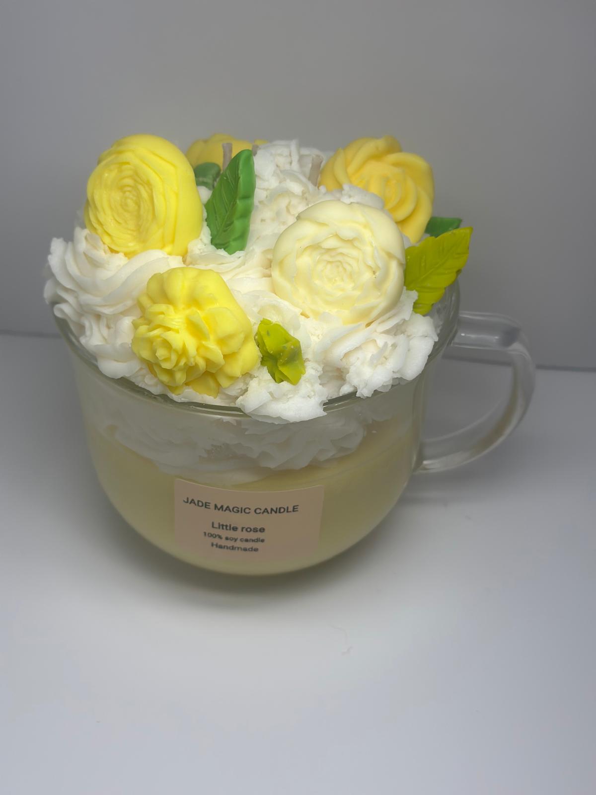Little Rose is a handcrafted candle designed to resemble a miniature rose garden — with soft white and pastel-yellow floral shapes, whipped wax textures, and elegant leaf details.